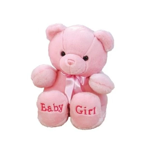 Celebrate the new baby in your life with our 10 inch plush pink Baby Girl Teddy Bear by Ebba! Measuring 10 inches tall, our plush pink Baby Girl Teddy Bear is made from a luxuriously plush pink fabric and is accented with a pink satin bow. Black lock washer eyes and an embroidered nose give it classic teddy bear appeal, and the bottom of its feet are embroidered to read ‘Baby Girl’.