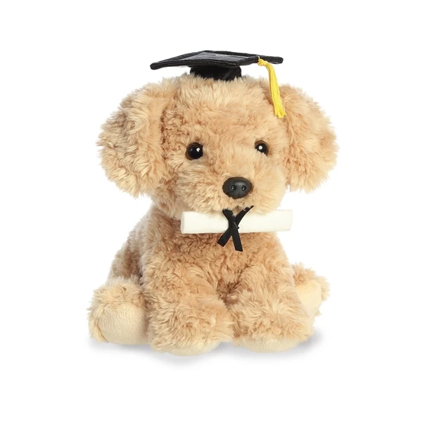 Say con-grad-ulations to someone special with the Graduation Stuffed Pup with Diploma and Cap by Aurora. Utterly adorable, this plush pup has light brown, fluffy fur that’s super soft and snuggly, and patiently holds a rolled-up diploma in her mouth, which is finished with a delicate black ribbon. Measuring approximately 8.5 inches, the Graduation Stuffed Pup with Diploma and Cap by Aurora proudly wears her own graduation cap, which is completed with a sunny yellow tassel which hangs down the side. The pawfect gift for any graduate, this stuffed pup will become one of their most prized pawsessions, and will constantly remind them of their achievements and the happy feelings that came with that occasion. Beautifully stuffed to make her extra cuddly, the Graduation Stuffed Pup with Diploma and Cap by Aurora has the most adorable face, with black and amber eyes and a shiny, boopable nose, and will take pride of place at any celebratory meal; she’ll even silently wish them ‘bone appetit’ as they tuck in to their post-graduation dinner.